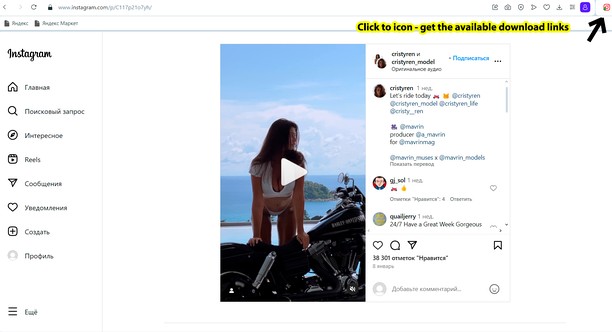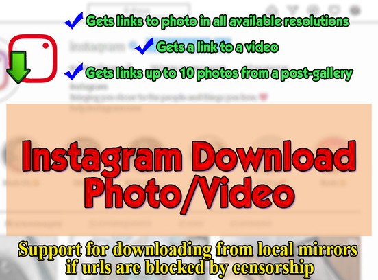 إدخال امتداد لتحميل الصور, معرض الصور ومقاطع الفيديو من Instagram الشبكة الاجتماعية بكرات تنسيق معتمد أيضا. الحصول على روابط مباشرة mp4 و jpg, فتح الصفحة المقابلة مع Instagram آخر ، انقر على أيقونة وانتظر النصي إلى الانتهاء من العمل - ثم عليك أن تختار واحدة من متوفرة permissions و حفظ الملف على جهازك