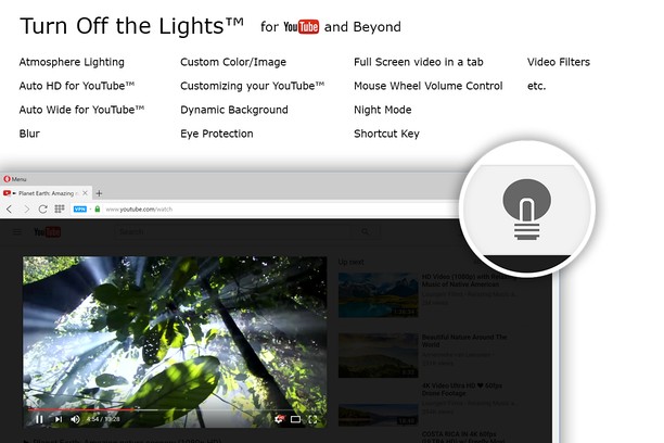 Genießen Sie ein vereinfachtes Surferlebnis mit der Browsererweiterung Turn Off the Lights. Mit nur einem Klick auf die Lampenschaltfläche wird Ihre Seite sanft abgedunkelt und der Fokus wird automatisch auf das Video gerichtet. Ein weiterer Klick stellt die Seite in ihren ursprünglichen Zustand zurück. Entdecken Sie zusätzliche Anpassungsoptionen auf der Seite „Turn Off the Lights-Optionen“, um Ihr Seherlebnis an Ihre Vorlieben anzupassen.